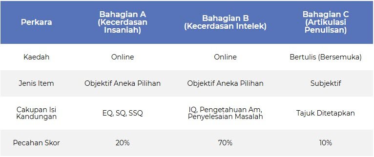 Contohnya, bahagian A “Kemahiran Insaniah,” pelajar diuji berdasarkan kebolehan interpersonal dan intrapersonal mereka. Soalan-soalan ini cenderung untuk mengukur kemampuan pelajar berkomunikasi, bekerja dalam kumpulan, dan menunjukkan empati. Bahagian ini mengandungi sekitar 20 soalan dengan waktu menjawab 30 minit.